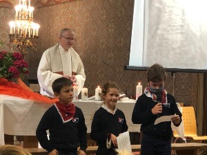 Die Eröffnung des Schuljahres konnten wir seit langer Zeit erstmals wieder in der Kapelle feiern. Jede Schulstufe hatte ihren Gottesdienst. Die Segensfeier der ersten Klassen hatte „Von Engeln begleitet“ zum Thema. Die Handpuppe Florian erzählte von seinen Schulsorgen, die aber am 2. Tag alle verflogen, dann erzählte ich die Geschichte vom barmherzigen Samariter. Ich hatte ein großes Herz ausgeschnitten, das verwandelt Menschen in Engel. Jedes Kind wurde unter dem Regenbogentuch gesegnet. Vier Kinder aus den vierten Klassen, die Schulengerln für die ersten Klassen, hielten mit uns das Tuch. Es wurde gesungen und viel gelacht. Die 2. bis 4. hatte das Thema Berg. Das neue Schuljahr türmt sich wie ein Berg, aber Gott ist immer an unserer Seite. Als Bergkameraden wollen wir zusammen halten und einander helfen.